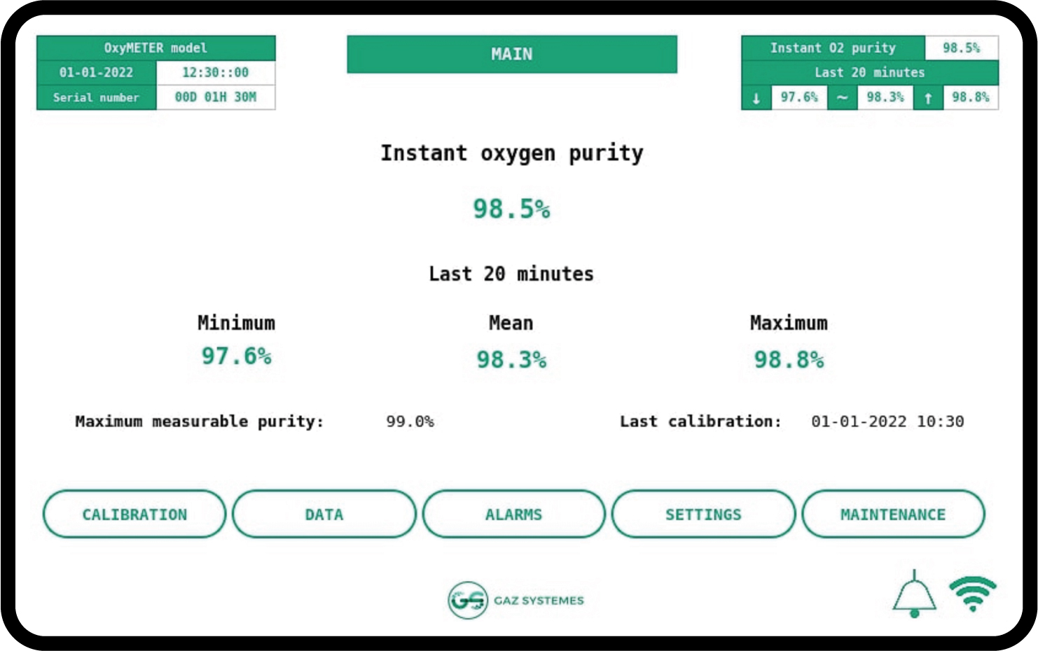 GAZ SYSTEMES analysers measure with accuracy the content of medical oxygen within the medical gas. These analysers are wall-mounted in a technical room. It is possible to connect this equipment to the building management system where all the technical information is centralized via the serial port or ethernet/wifi connection.
